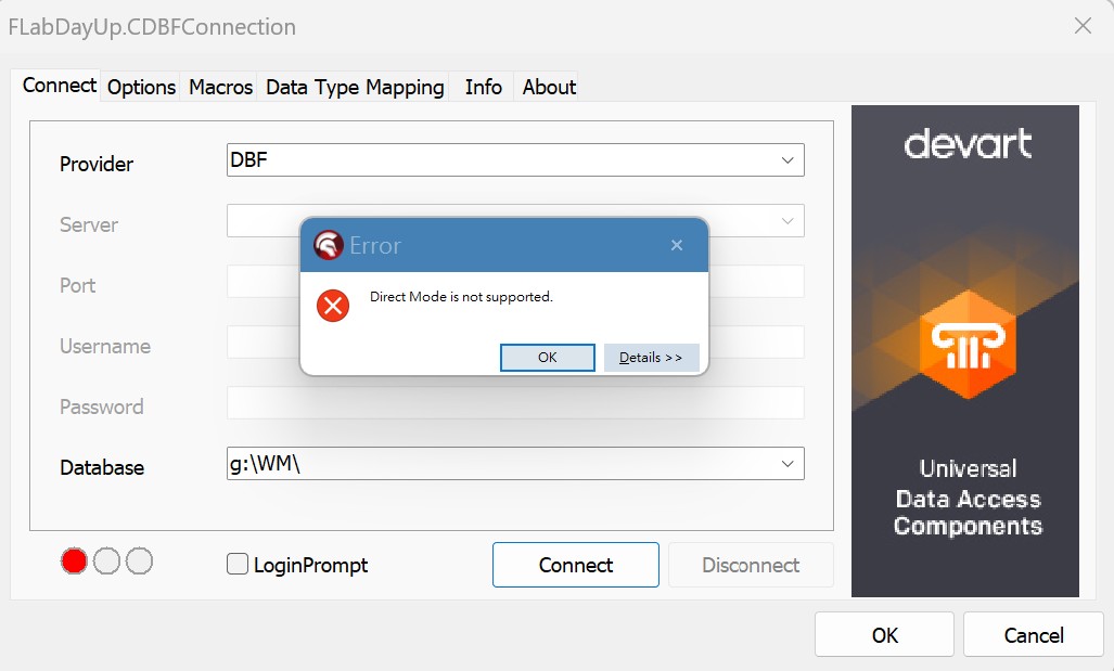 Direct Mode is not supperted with DBF file connection