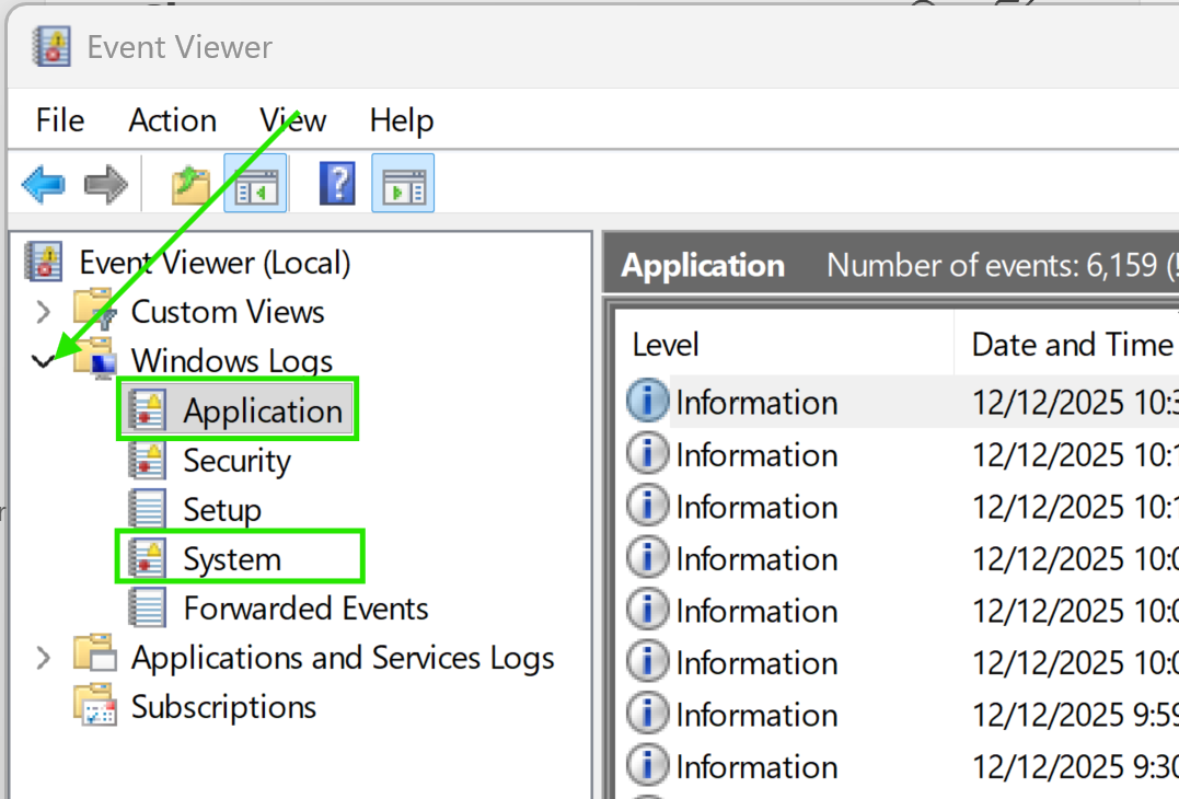 After the Event Viewer interface opens, expand the Windows Logs section.